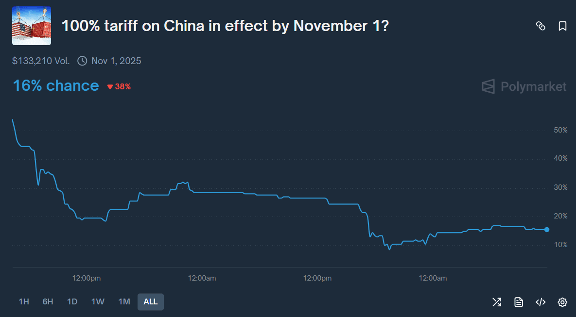 Na predikčních trzích si lze vsadit, zda Trump zavede 100% cla na Čínu do 1. listopadu. Zpočátku obchodníci predikovali, že k tomu dojde z 50 a více procent, ale po jeho víkendových komentářích šance klesla k 15 %.