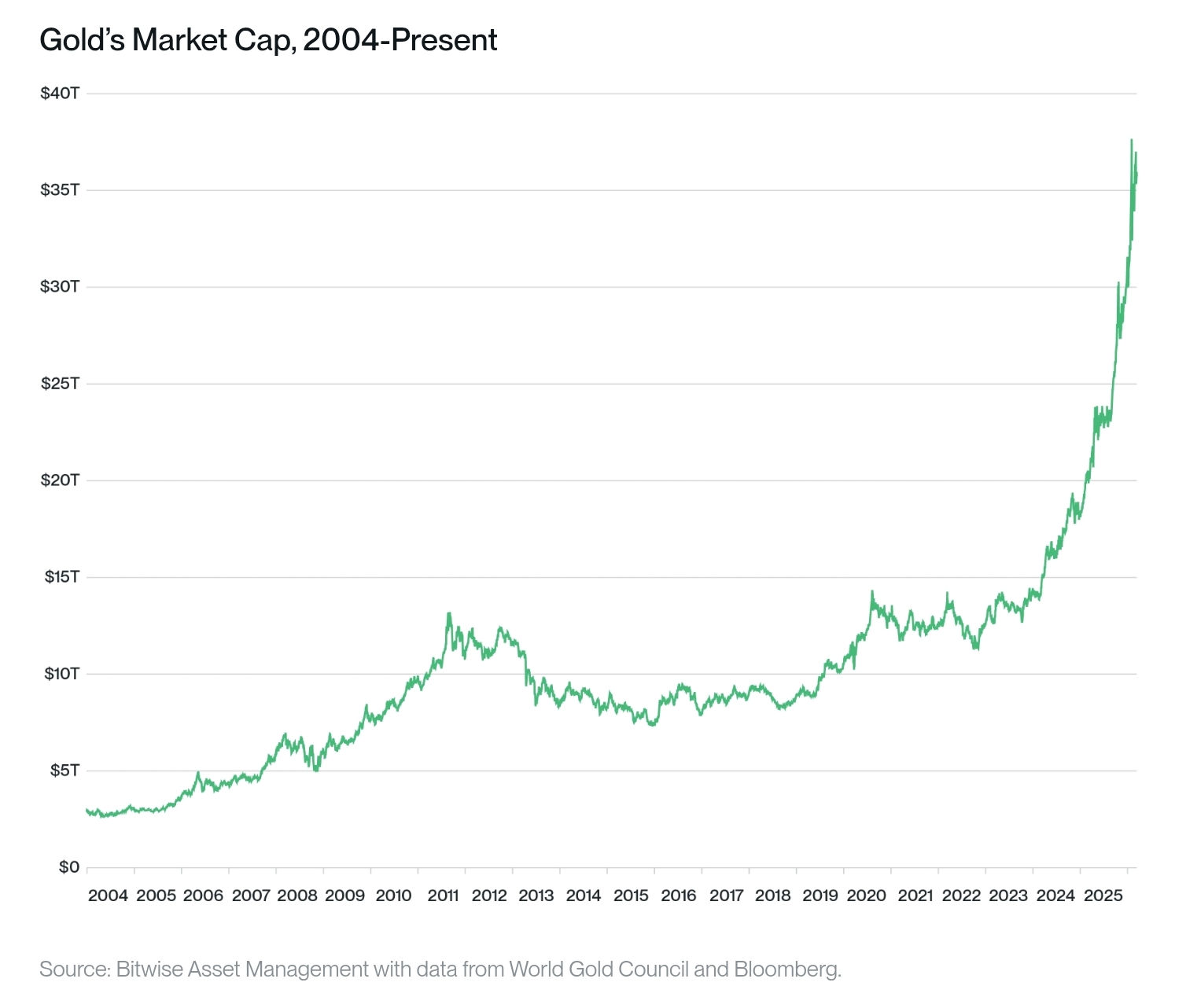 Podle odhadů společnosti Bitwise má globální trh s aktivy určenými k uchování hodnoty hodnotu přibližně 38 bilionů dolarů.