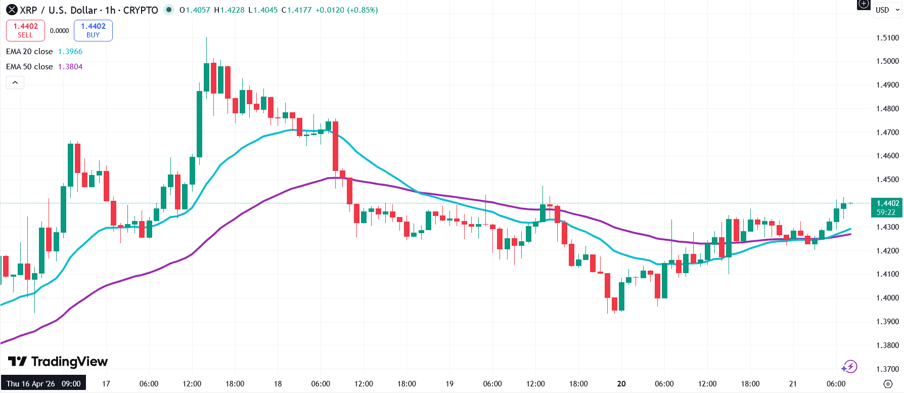 Hodinový graf XRP spolu s 20denním a 50denním EMA.