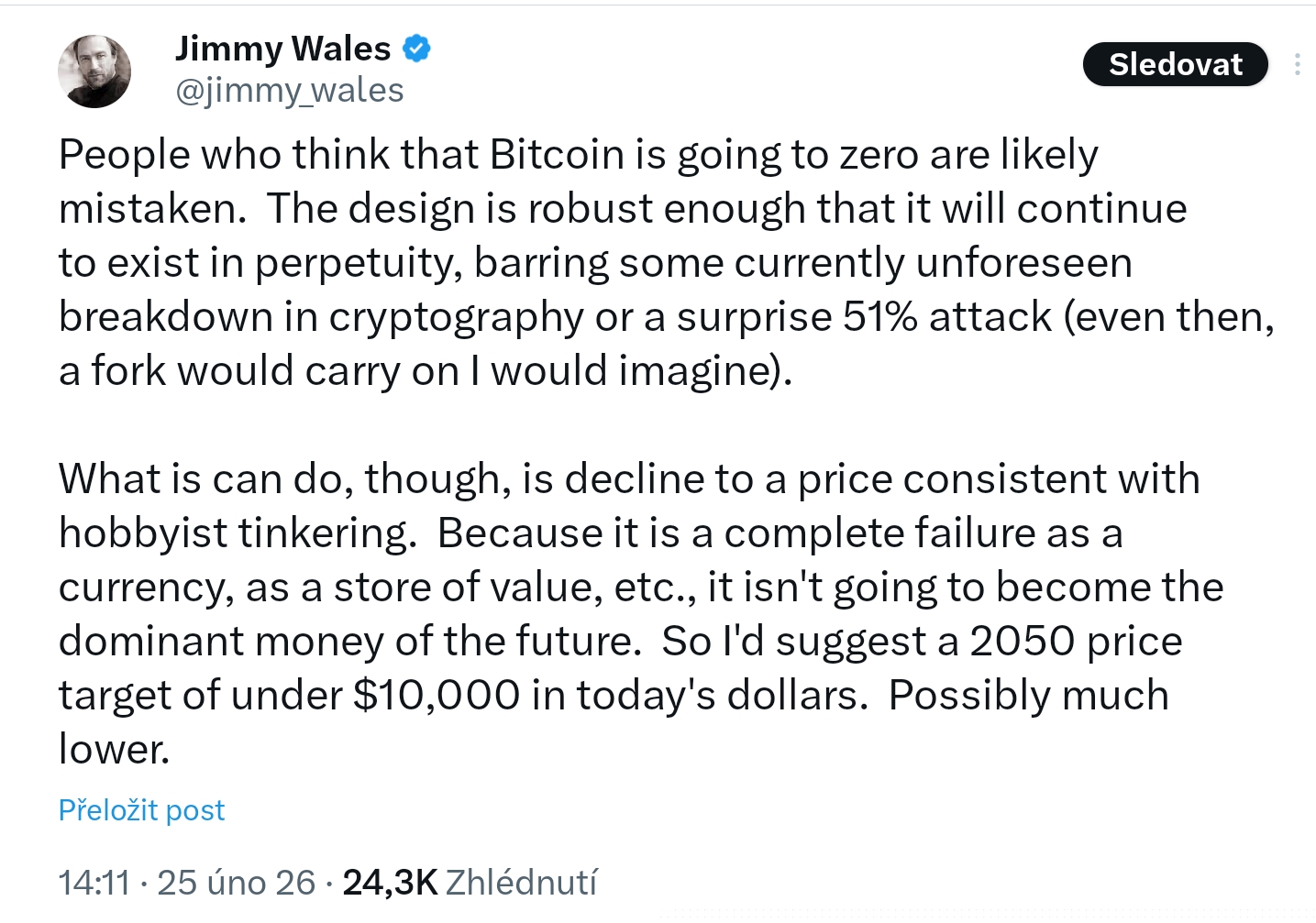 Spoluzakladatel Wikipedia Jimmy Wales znovu rozvířil krypto komunitu. V sérii veřejných vyjádření označil Bitcoin za “úplné selhání jako měnu” a předpověděl, že jeho cena může do roku 2050 klesnout pod 10 000 dolarů.