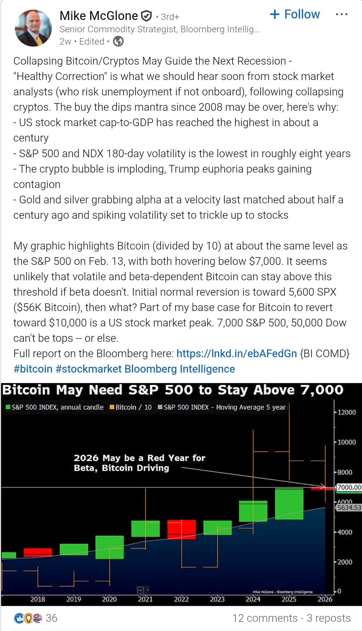 Seniorní komoditní stratég Mike McGlone z Bloomberg Intelligence varuje, že oslabující kryptotrh může být předzvěstí širší ekonomické recese.