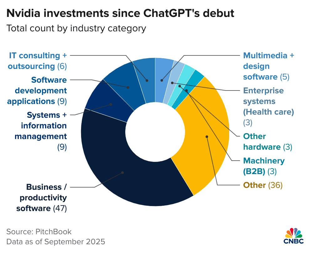 Rozložení investic Nvidie od vydání ChatGPT, platné k září 2025.