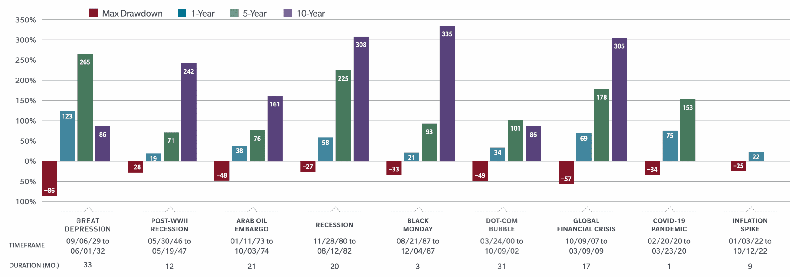 Během posledního půlstoletí se výrazné propady a následná oživení indexu S&P 500 opakovaly v rytmu, který dlouhodobému investorovi hraje do karet.
