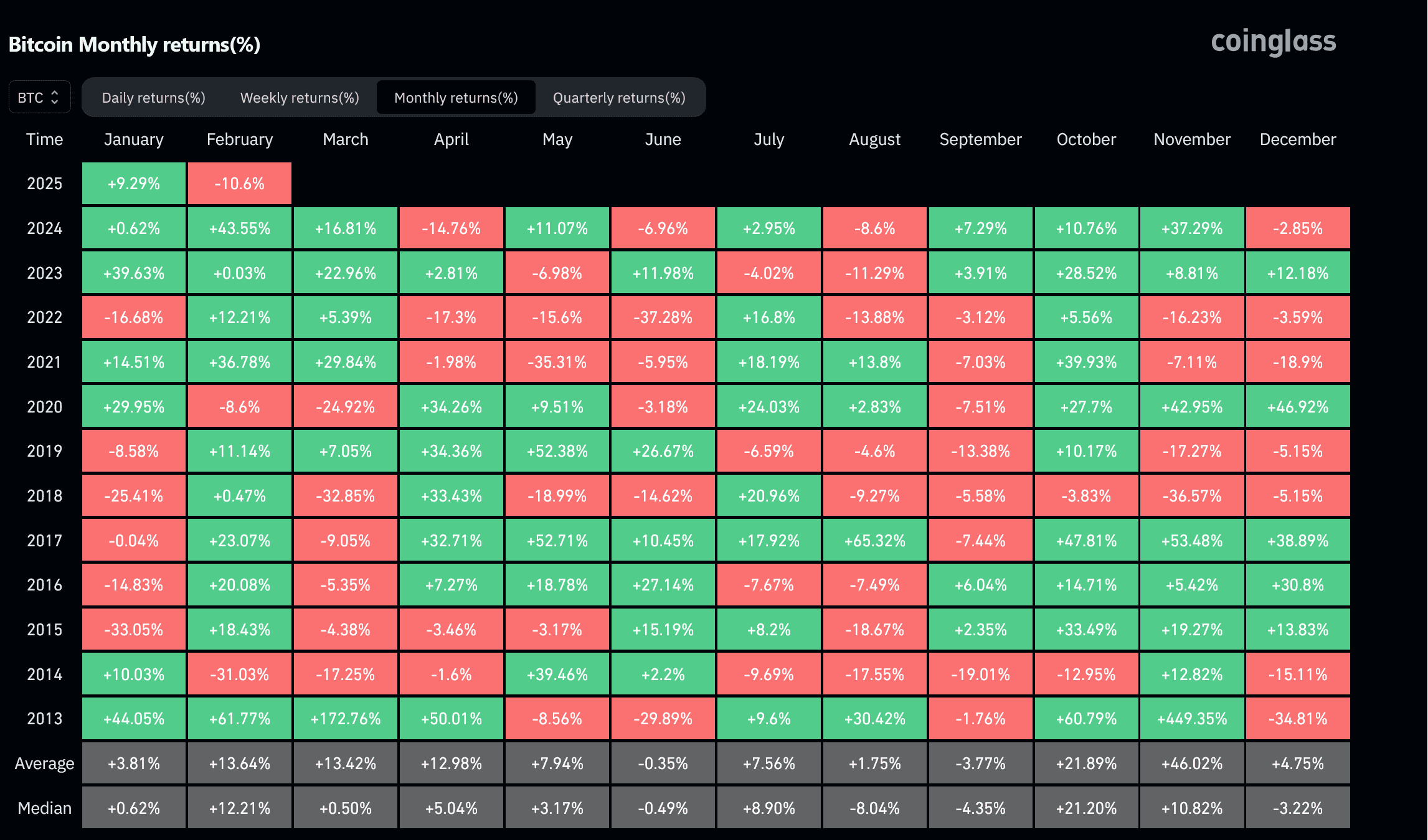 Historická výkonnost bitcoinu dle jednotlivých měsíců