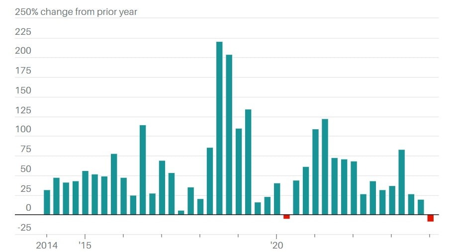 Meziroční změna v počtu dodávek elektromobilů Tesla v jednotlivých kvartálech