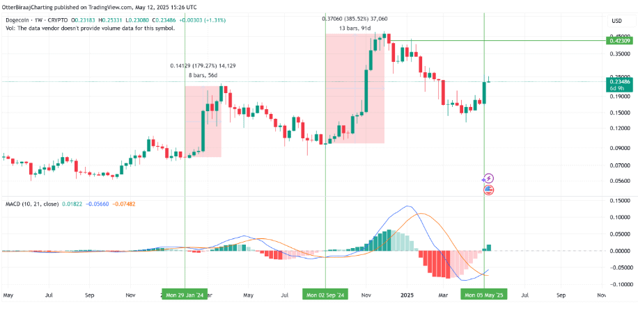 Na základě další analýzy opět analytik Trader Tardigrade řekl, že Dogecoin dosáhne 1 dolaru (330% růst). Došlo totiž k překřížení MACD na týdenním grafu již potřetí od roku 2024. Historicky takový vývoj vedl k rapidnímu růstu ceny.