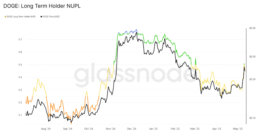 K býčí náladě přispívá i to, že metrika nerealizovaného zisku/ztráty (NUPL) dlouhodobého držitele Dogecoinu poprvé od 1. března 2025 překročila hranici 0.5.