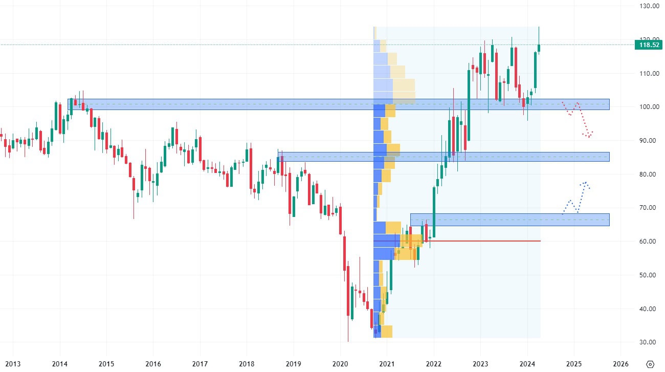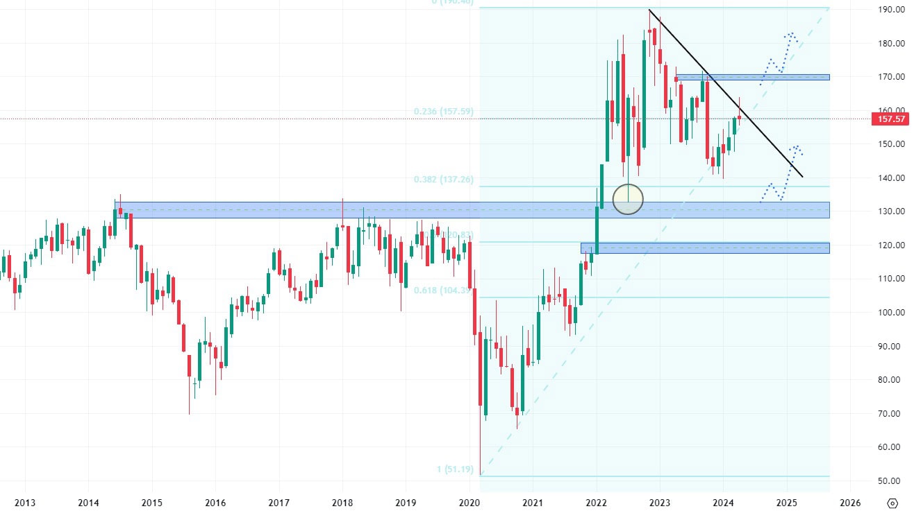 Naštěstí struktura trhu vytvořená mezi lety 2020 – 2023 nabízí velké množství netestovaných supportních úrovní, takže akcie této společnosti mají i na nižších hodnotách mnoho důvodů k růstu.