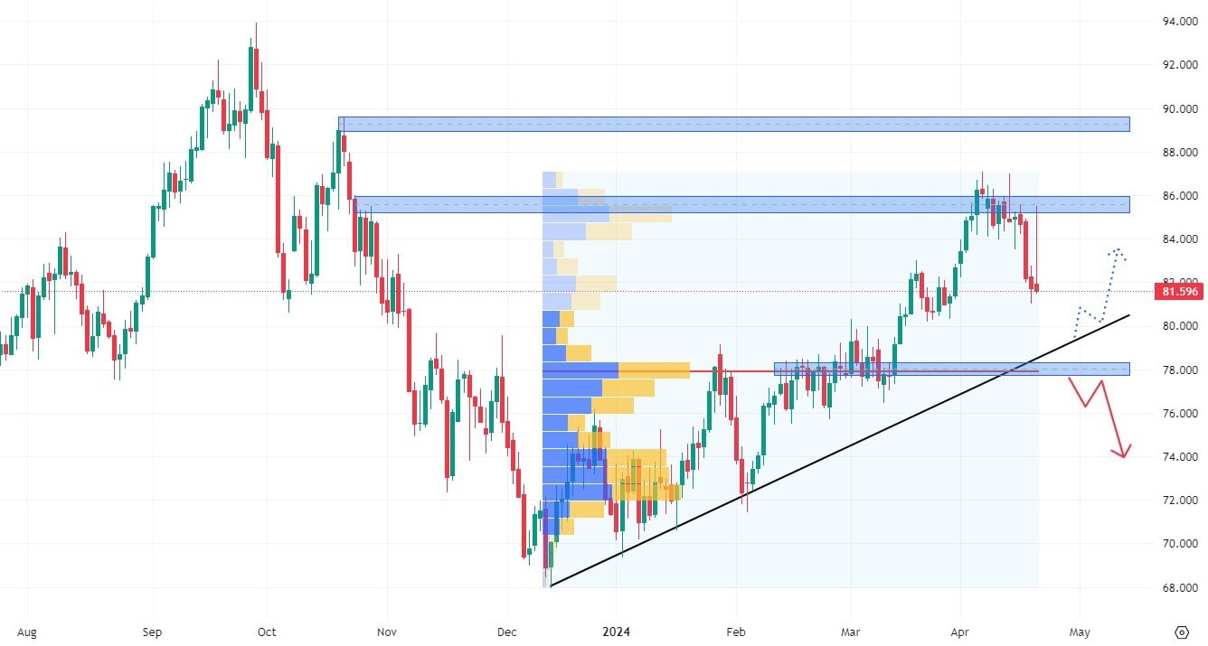 Ropa WTI se v letošním roce pohybuje nad hodnotou trendové čáry a také výrazně nad úrovní svého největšího volume. To svědčí o neustálém tlaku kupců, který je podpořen makroekonomickými nejistotami, především ohledně válečných konfliktů.