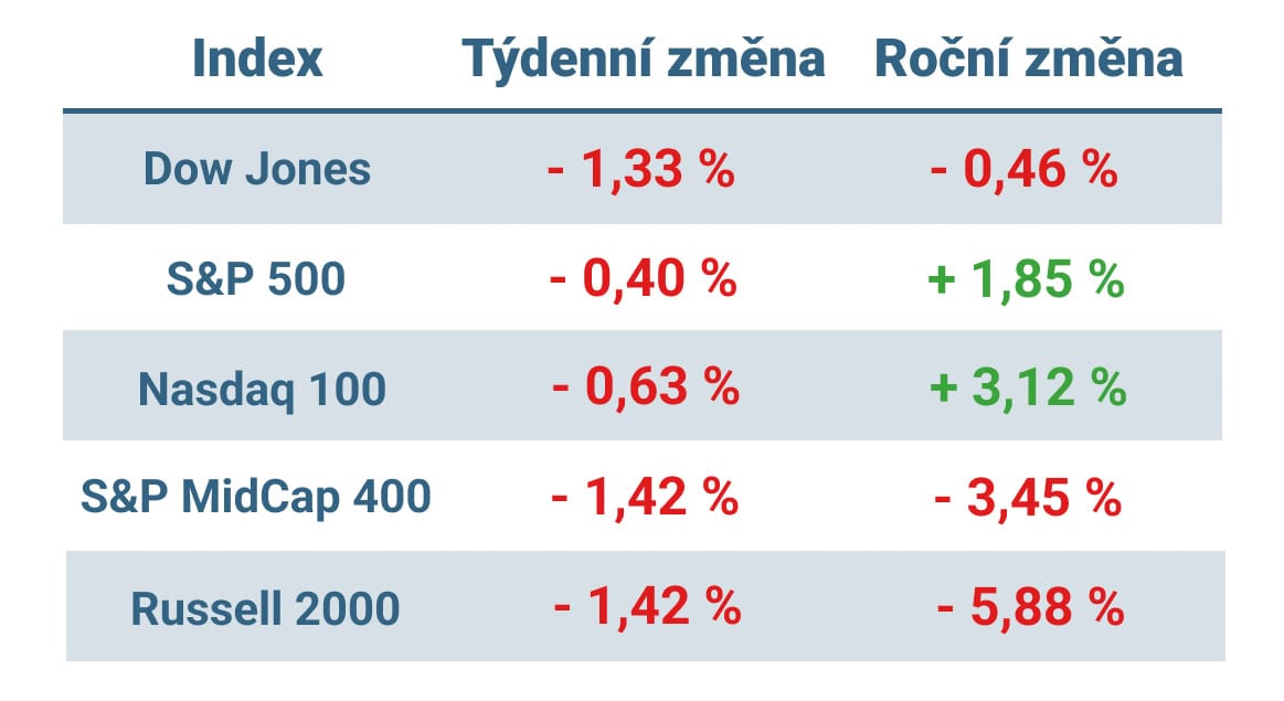 Americké akciové indexy během týdne oslabily. Hůře si přitom vedly indexy menších společností, když indexy S&P MidCap 400 a Russell 2000 oslabily o 1,42 %.