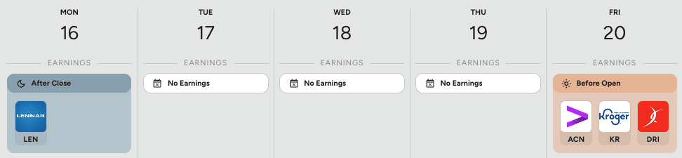 Co se týče výsledků hospodaření firem, za zmínku stojí pouze pondělní zpráva společnosti Lennar a páteční zpráva společnosti Kroger.