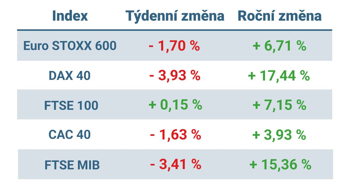 Panevropský index STOXX Europe 600 skončil v týdnu o 1,70 % níže v důsledku obnovené nejistoty ohledně obchodní politiky USA a eskalace geopolitického napětí na Blízkém východě.