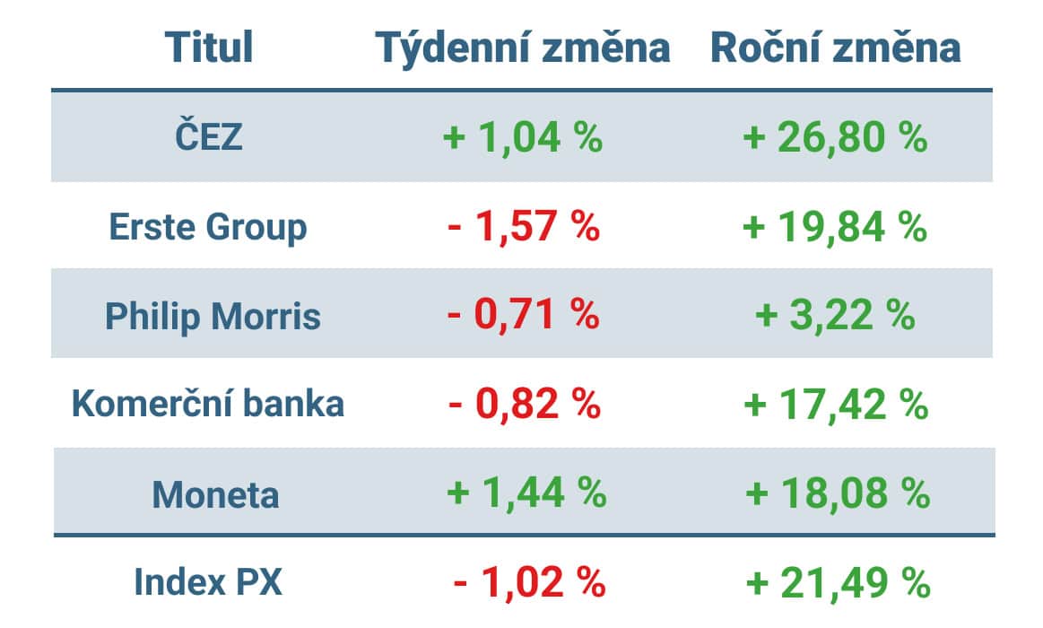 Přes 1 % si naopak připsala největší emise pražské burzy, akcie ČEZ, a vůbec nejlépe se z námi sledovaných titulů dařilo v uplynulém týdnu akciím Moneta.