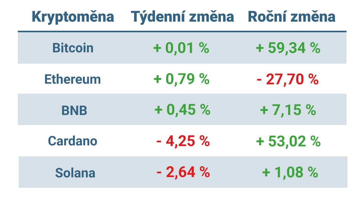 Cardano a Solana naopak mírně ztrácely, ale ani v tomto případě týdenní pohyb nepřekonal nižší jednotky procent.