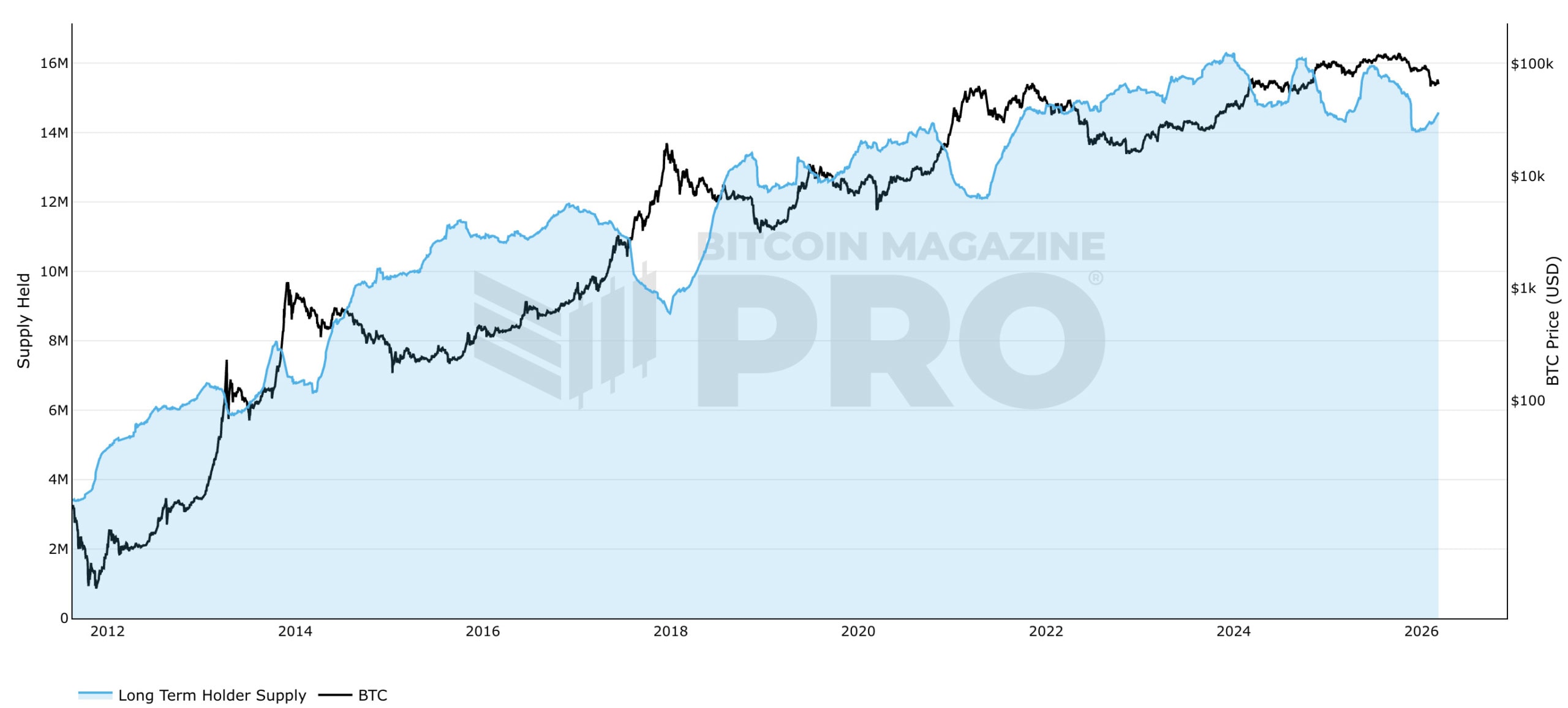 Množství BTC, které drží dlouhodobí investoři a graf jeho ceny
