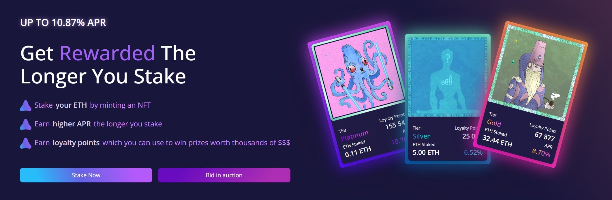 Čím déle stakujete, tím větší úrok máte. Ether.fan NFTs je možné zakoupit i na sekundárním trhu.