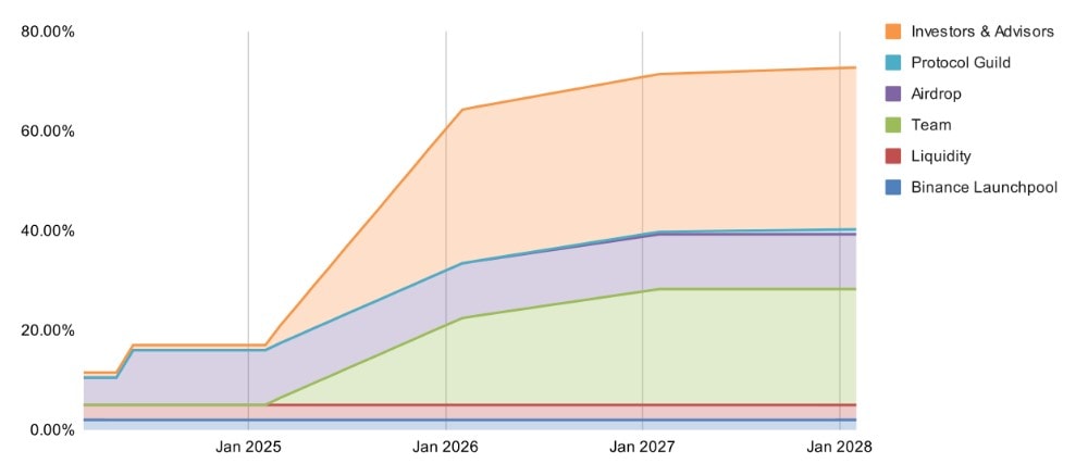 Celková maximální zásoba ETHERFI je 1 miliarda tokenů, z čehož v den zalistování na Binance bude v oběhu 11,52 % z nich. Tokeny se pak budou postupně uvolňovat do oběhu dle schématu níže s největšími emisemi v roce 2025.
