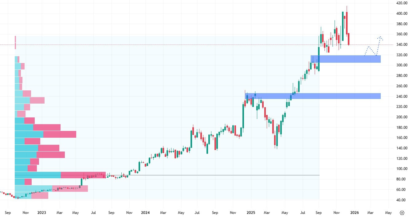 Akcie Broadcom se obchodují kousek pod svými cenovými maximy a blíží se k hodnotě nejbližšího supportu. Pokud by cena akcií klesla pod 300 USD, může to být začátek výraznější korekce, jakou sledujeme o akcií Oracle.