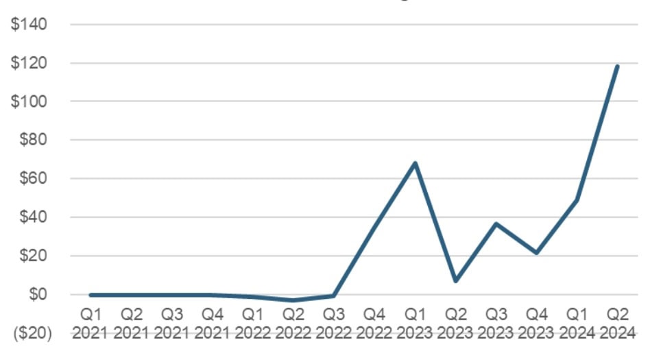 Ve neprospěch společnosti hovoří také extrémně zvyšující se počet odepsaných (nesplacených) úvěrů. V půlce roku 2024 tyto odpisy dosáhly hodnoty 120 milionů USD, a to jen za jeden kvartál.