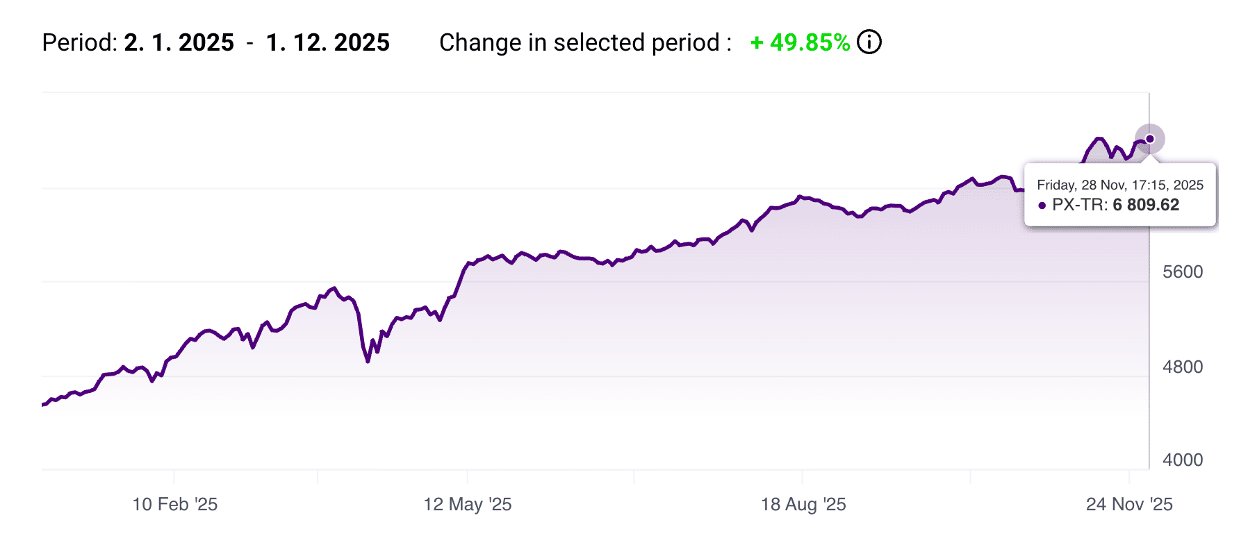 Hlavní index pražské burzy v listopadu vzrostl o více než 4 % a za rok 2025 už připisuje přes 40 % bez dividend. Včetně dividend se celkové zhodnocení blíží 50 %, což je výkon, který výrazně překonává velké světové indexy jako S&P 500 nebo DAX.