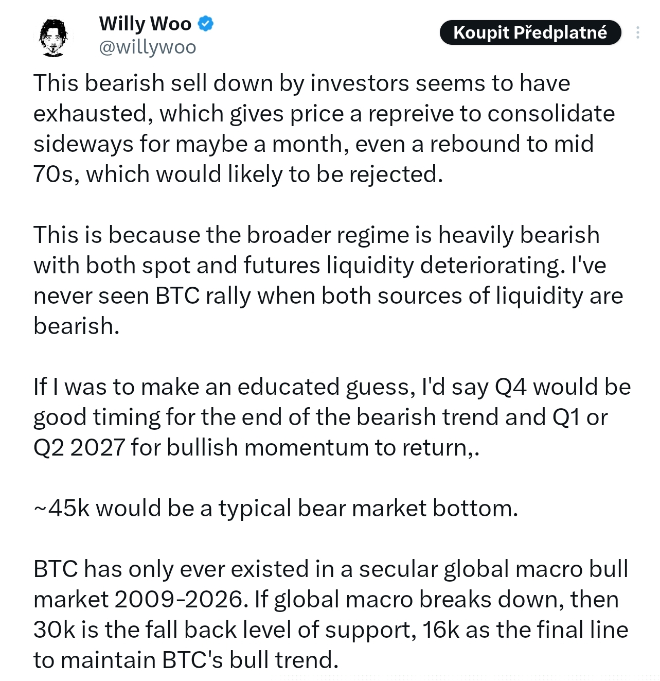 Trh s Bitcoinem může vstupovat do fáze úlevy. Podle on-chain analytika Willyho Woo se medvědí výprodej ze strany investorů prakticky vyčerpal, což by mohlo ceně poskytnout prostor pro několik týdnů konsolidace.