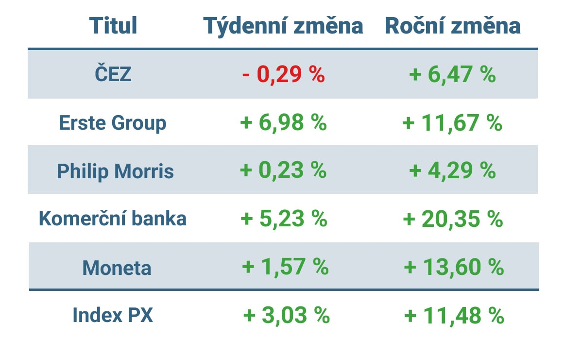 Pražská burza si během posledního týdne opět připsala zisk přes 3% a od začátku roku tak index PX vzrostl o více než 11 %.