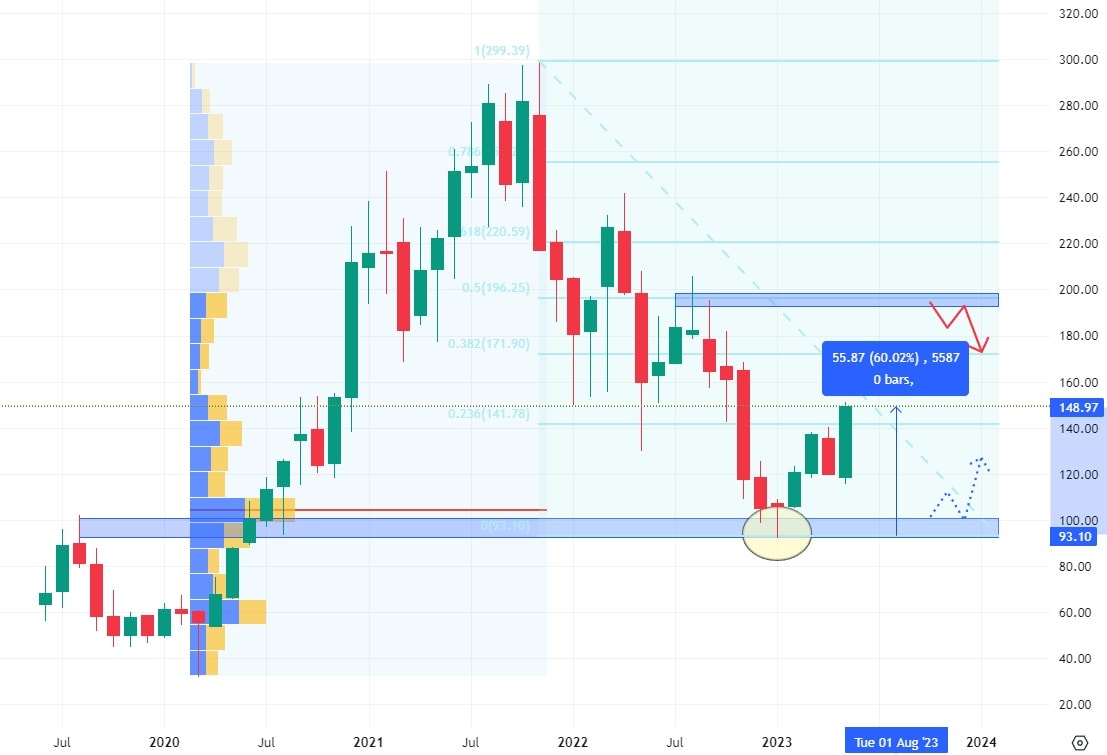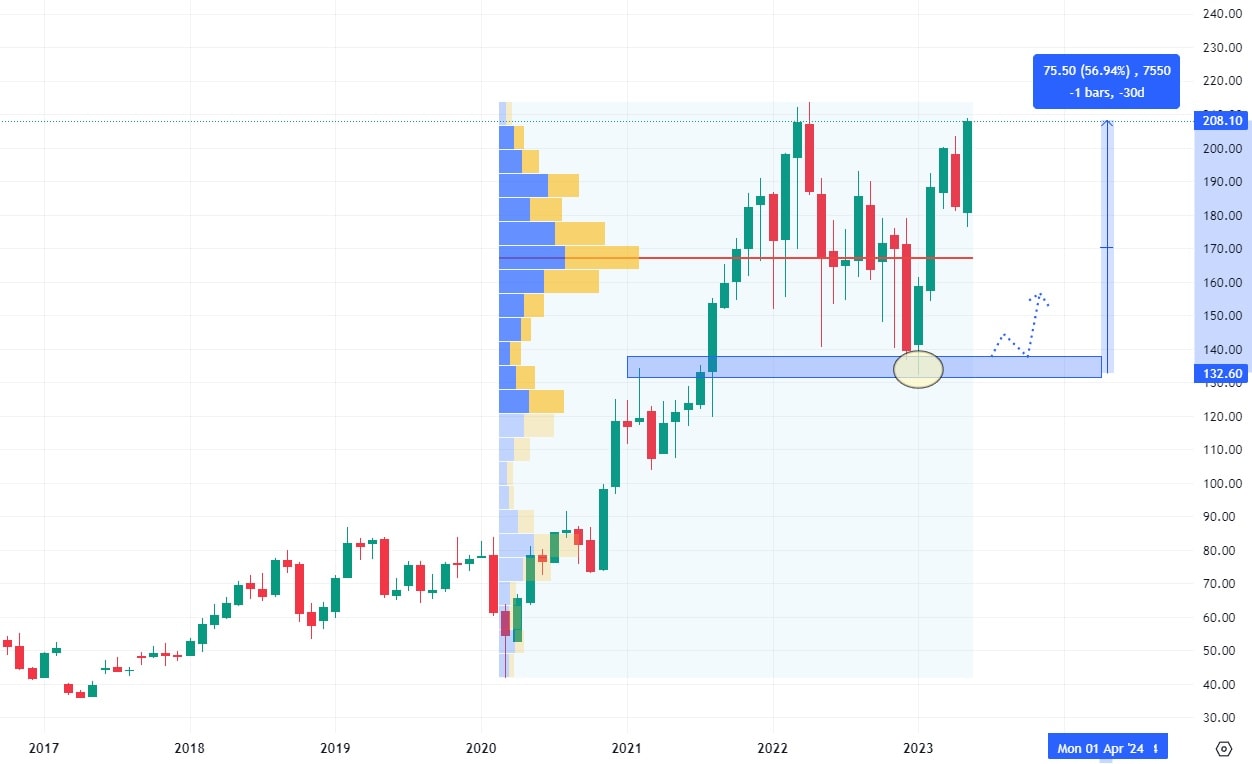 Výrazným akciovým propadem si prošla tato společnost v roce 2022, kdy se pád jejích akcií zastavil až na hodnotě nejsilnějšího volume od jejího IPO. V letošním roce je ovšem situace mnohem pozitivnější, akcie CrowdStrike dokázaly posílit již o 60 % a pomalu se blíží k nejbližší rezistenci, která se nachází na ceně 200 USD za akcii.