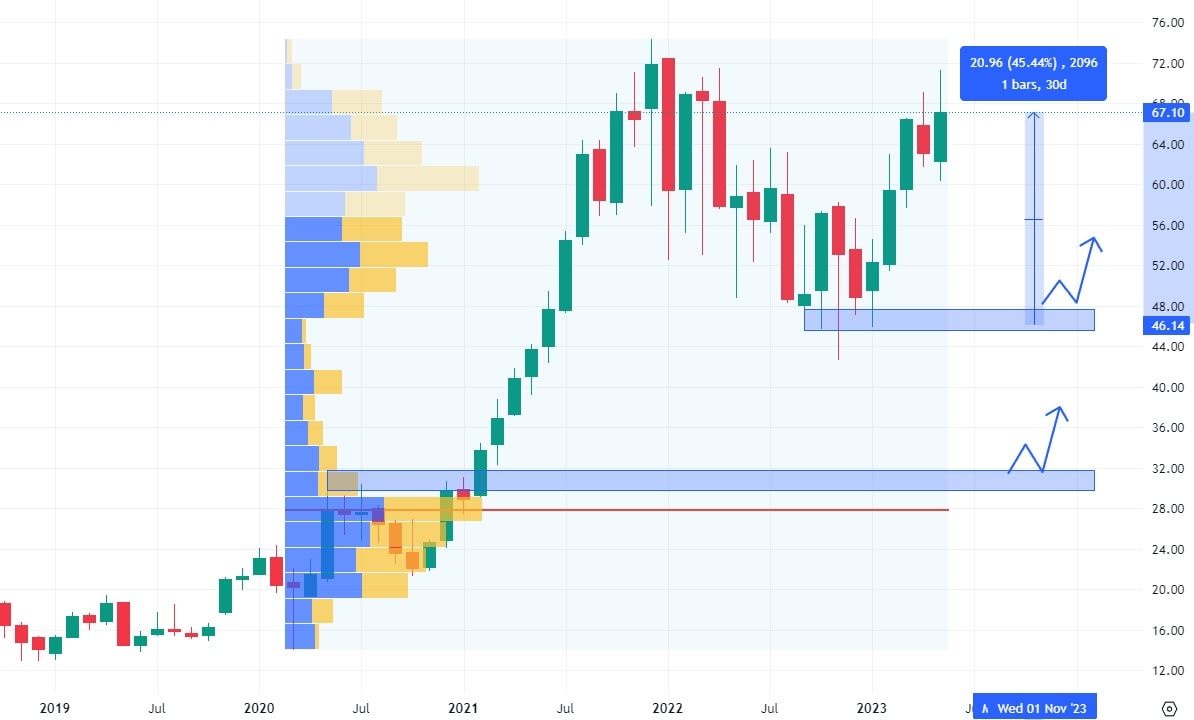 Zajímavého letošního zhodnocení dosáhly i akcie Fortinet, které vykázaly růst 45,44 % a v současné době se obchodují blízko svých historických maxim. Po stabilním růstu akcií došlo k poměrně volatilnímu roku, kdy akcie této společnosti oslabily o 20 USD. K vytvoření swingového low došlo ještě v loňském roce, což byl první signál k nástupu pozitivního sentimentu.