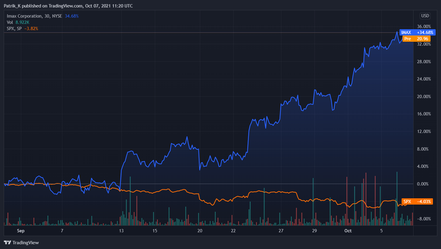 Akcie Imax v září vzrostly o pětinu a ve svém pohybu vzhůru pokračovaly i první říjnový týden. Akcie řetězce kin otevřely 1. září na ceně 15,79 dolaru a 6. října činila jejich uzavírací cena téměř 21 dolarů. Za toto období tak akcie Imax vzrostly téměř o 35 %. Index S&P 500, benchmark amerického akciového trhu, ve stejném období klesl o 4 %.