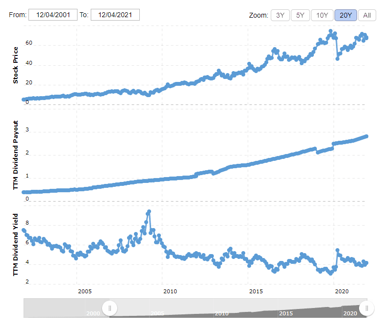 Společnost je opravdu stabilní, neboť se může pyšnit titulem dividendový aristokrat. Dividendu vyplácí spolehlivě a pravidelně. Navíc za posledních 26 let dividendu nepřetržitě navyšovala. Aktuálně její akcie přinášejí investorům 3,93%výnos. Vývoj dividendy a dividendového výnosu si můžete prohlédnout zde.