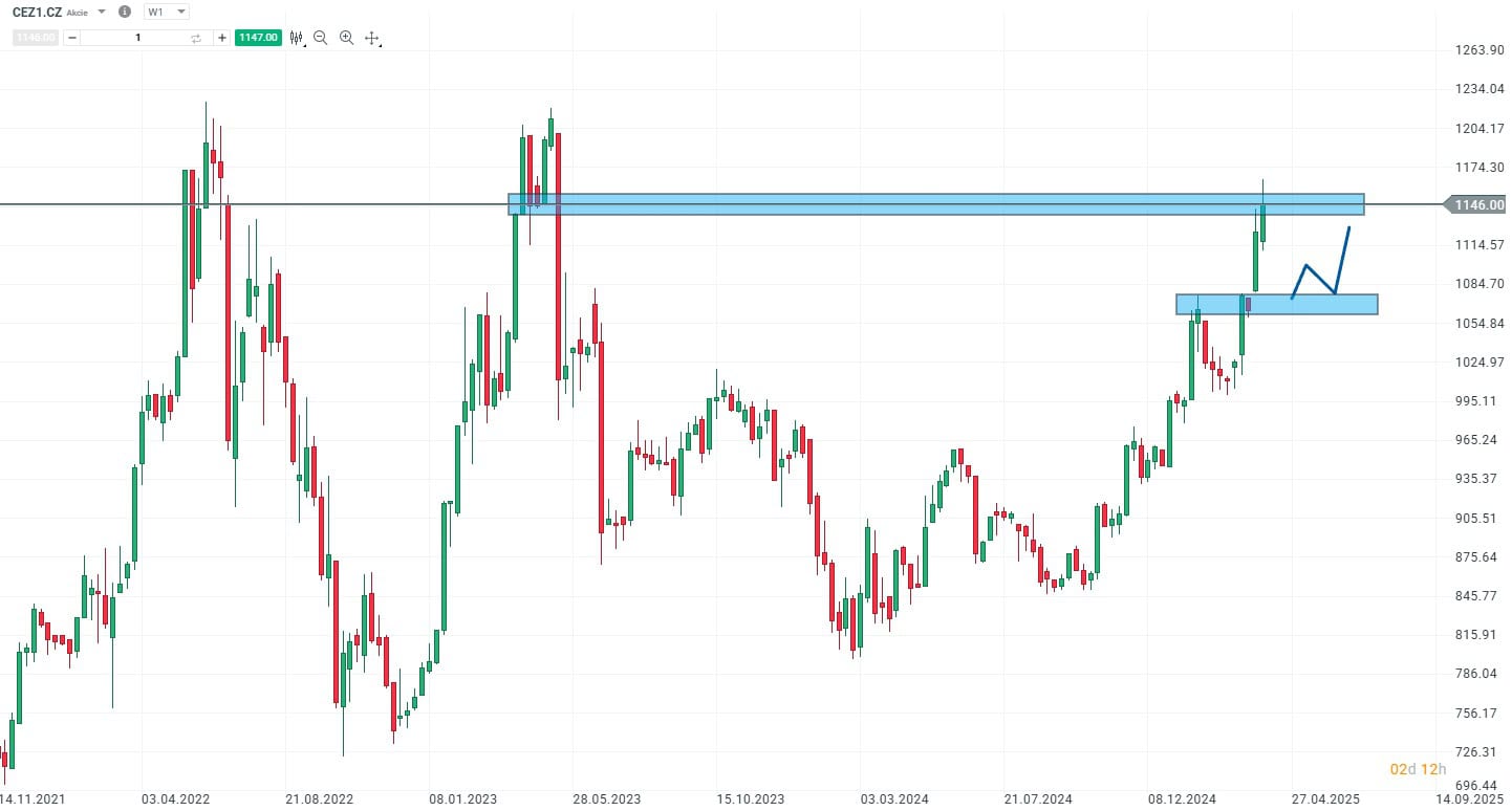 Akcie ČEZ se obchodují na hodnotách z roku 2023 a v současné době testují hodnotu důležité rezistenci. Vzhledem k agresivnímu růstu jejich ceny může nyní přijít technická korekce, kterou očekávají i významné světové bankovní domy.