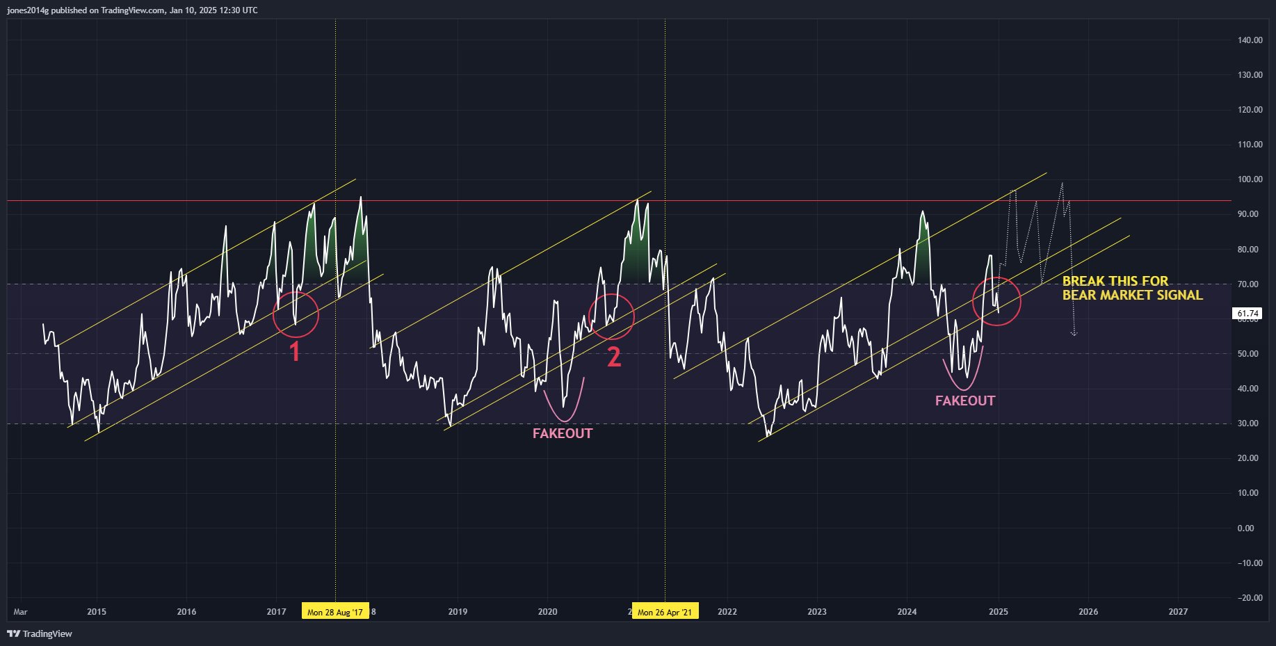 RSI celkové tržní kapitalizace kryptoměn na týdenním grafu