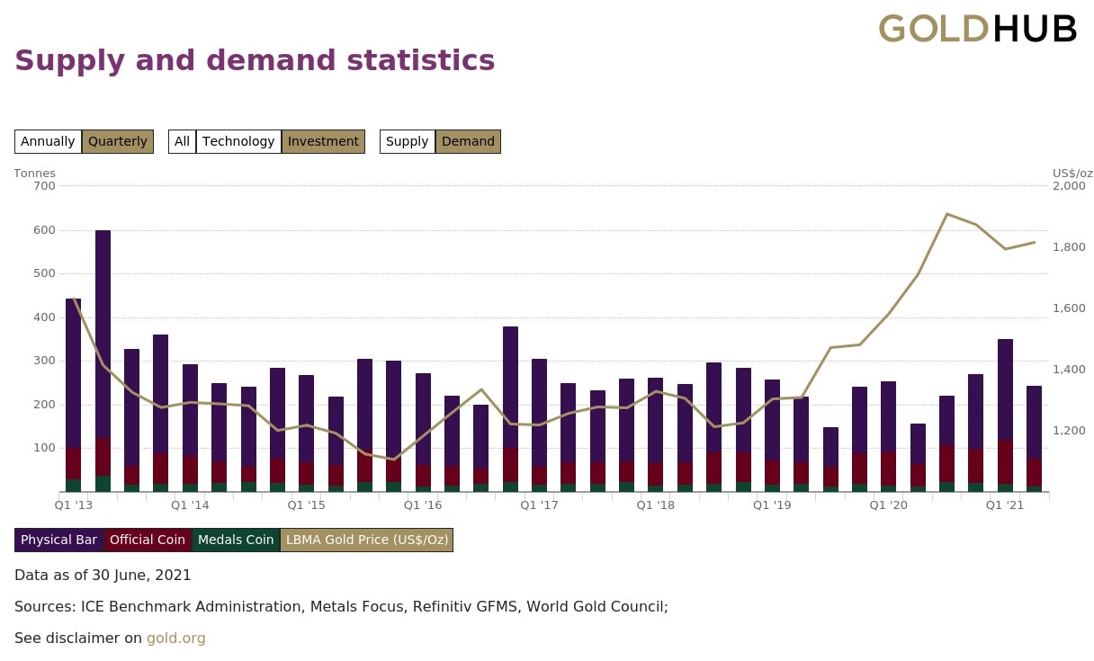 Jak vyplývá z přiloženého grafu, poptávka po fyzickém zlatě od druhého kvartálu roku 2020 až do prvního kvartálu letošního roku stabilně stoupá. Za druhý kvartál sice došlo ke snížení poptávky, ale v kontextu několika let můžeme cca 245 tun považovat za takový průměrný standard. První čtvrtletí letošního roku nám však říká, že motivace zajišťovat se proti inflaci je pořád silná.