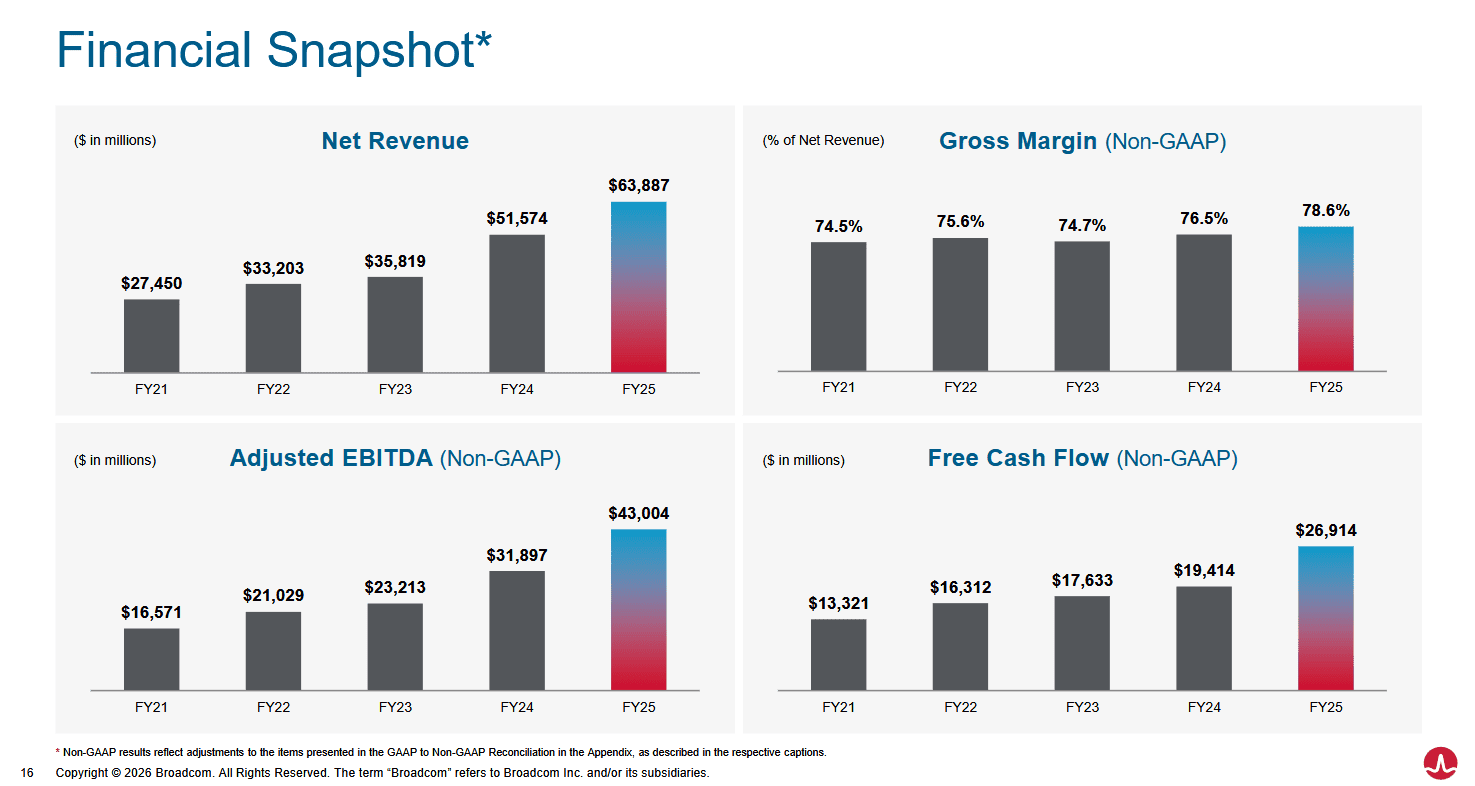 Klíčové finanční metriky Broadcomu za posledních několik let.