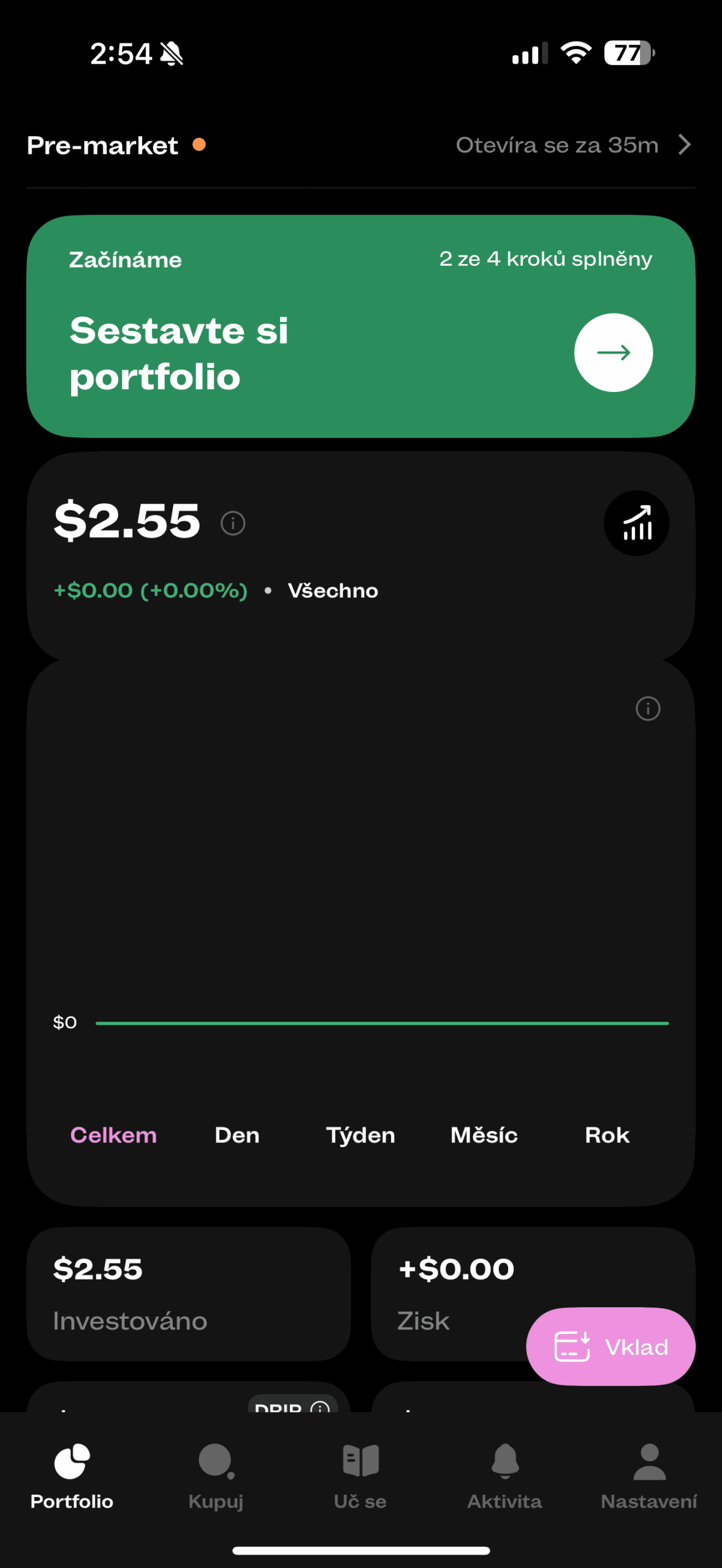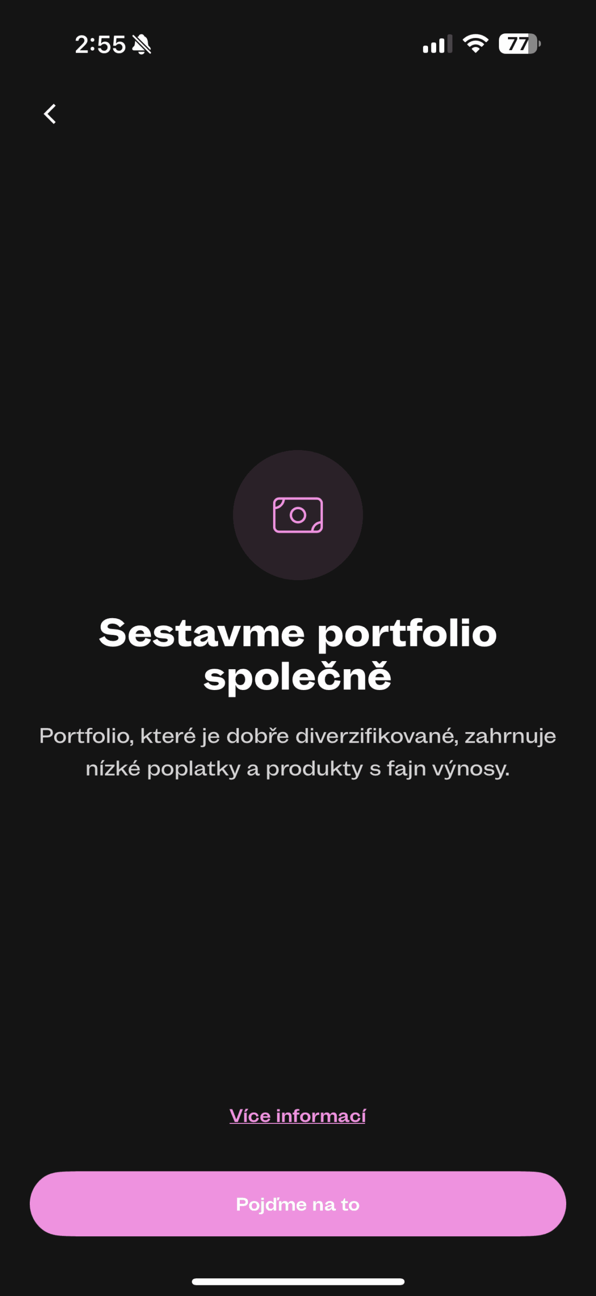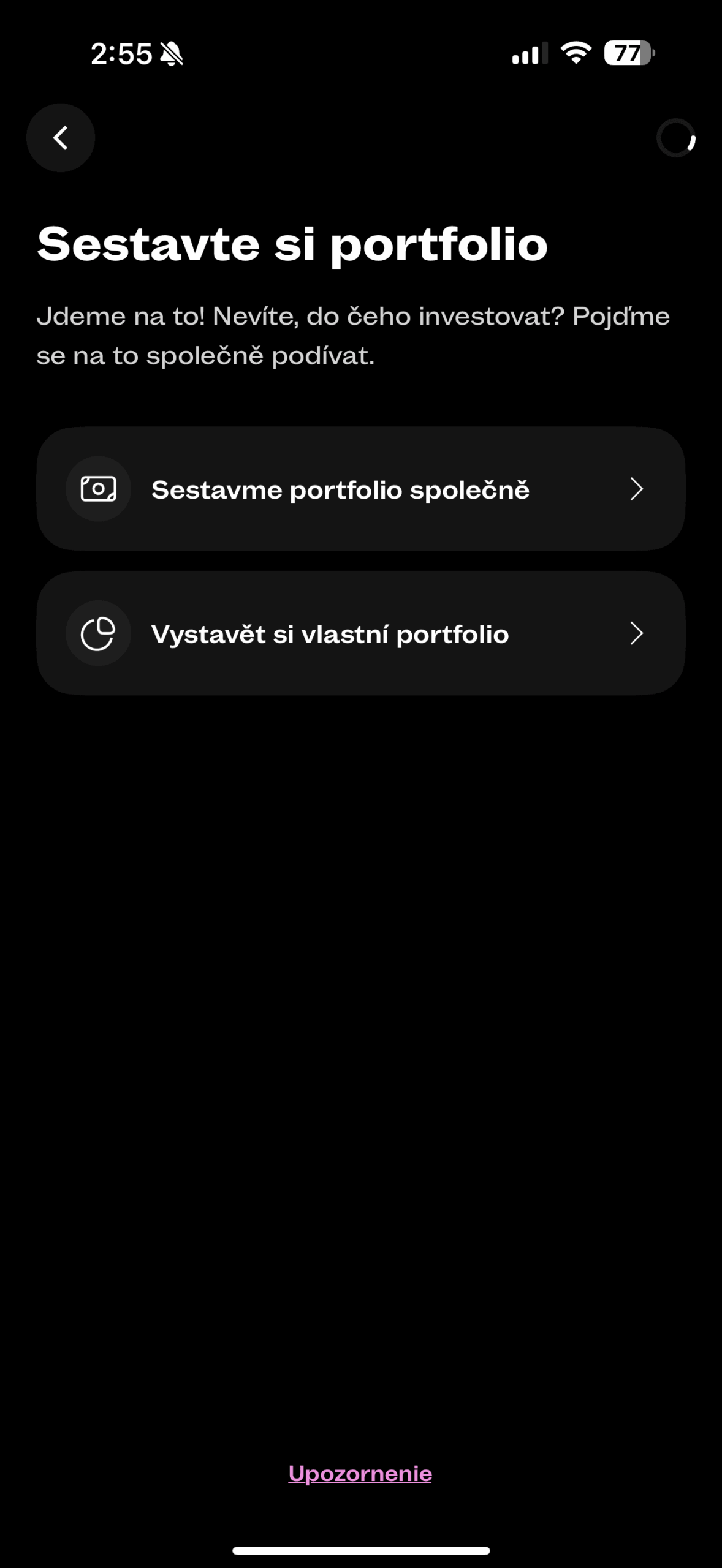 Na první kartě vidíte portfolio a možnosti investice. Tedy na první načtení aplikace vidíte, do čeho investujete a případně si přidáte něco vlastního. Nováčci určitě ocení sestavení automatického portfolia. Portfolio si totiž můžete i nechat doporučit na základě otázek z formuláře.