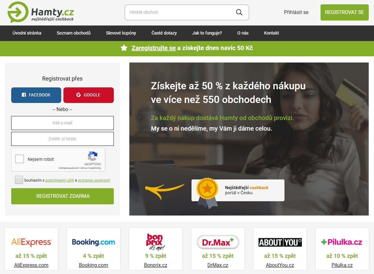 Hamty je oblíbený cashbackový portál, který nabízí nadstandardní výši odměn, v některých případech až 50 % z nákupu. Portál spolupracuje s více než 550 obchody jako AliExpress, Dr. Max, Notino nebo Lidl.