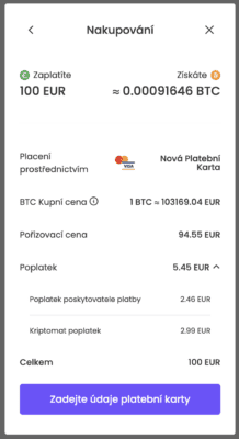 V lednu 2025 při našem testování jsme viděli následující poplatky při snaze koupit BTC za 100 EUR kartou: