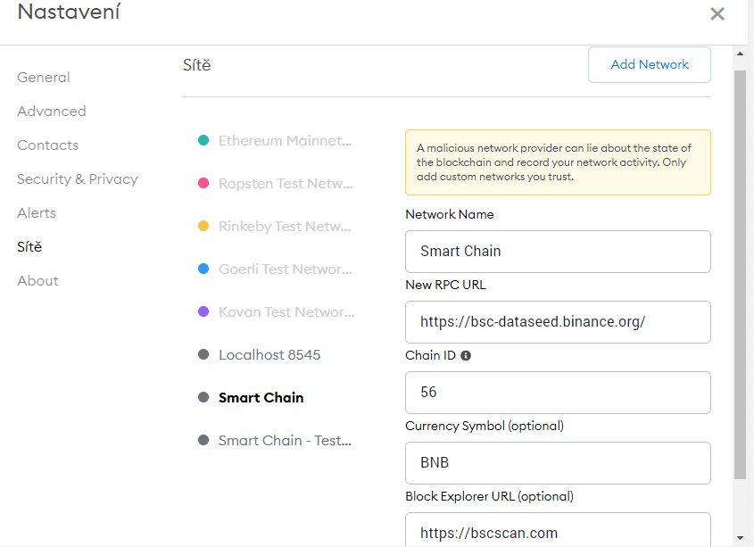 MetaMask je primárně Ethereová peněženka. Jelikož je ale BNB Smart Chain v podstatě její kopií a využívá stejné principy, můžeme peněženku s klidem na BSC napojit.