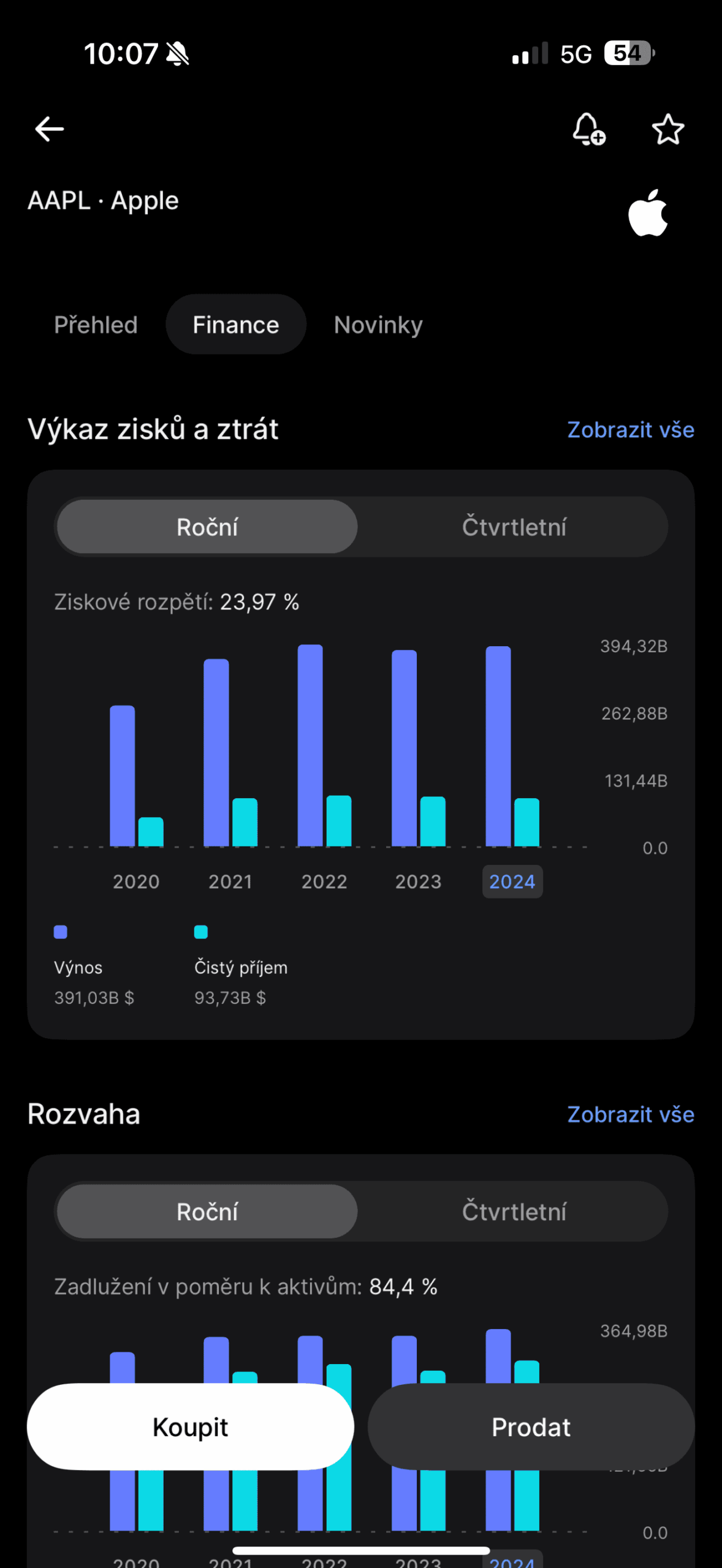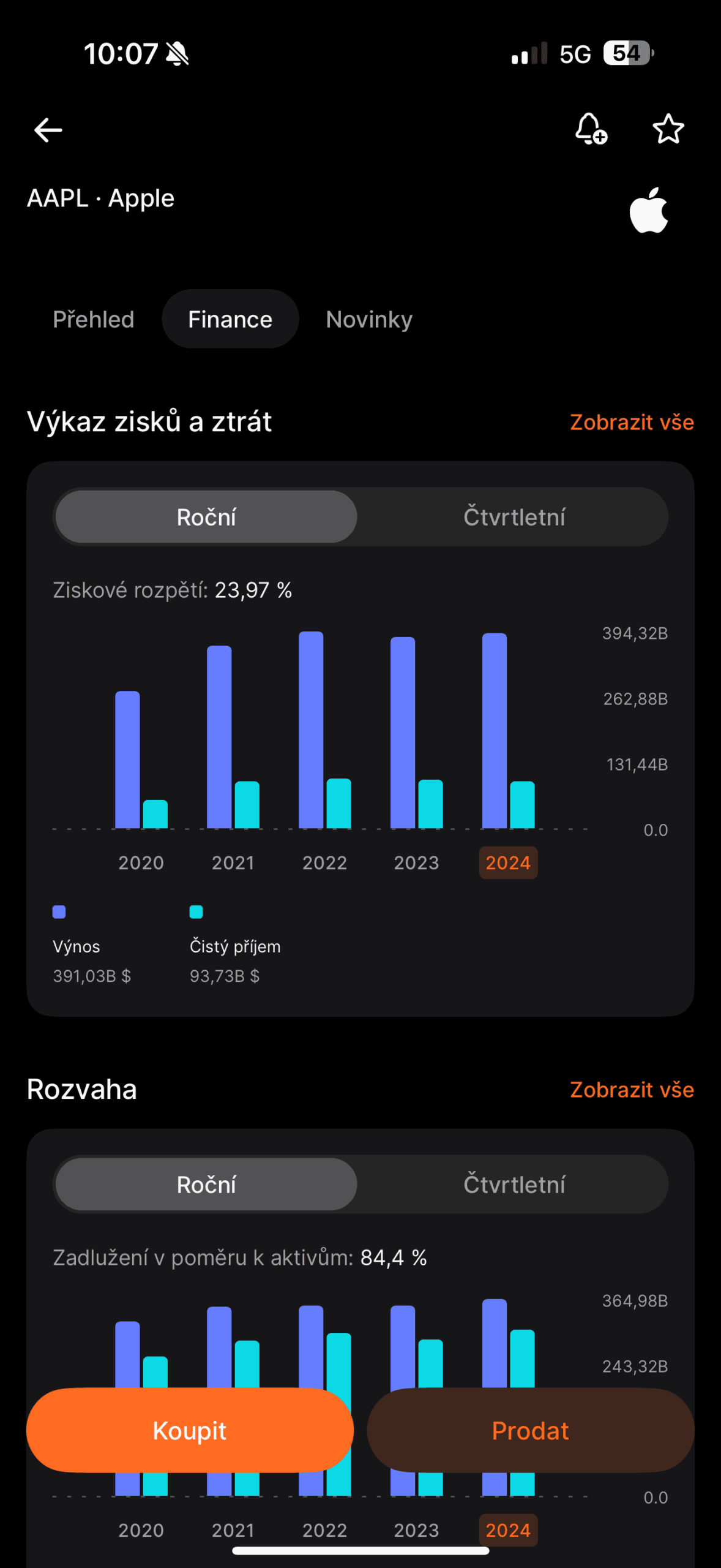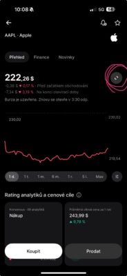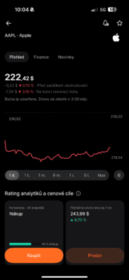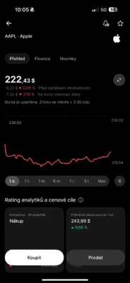 Pokud si otevřu akcie Apple v aplikaci Revolut a v aplikaci Revolut Invest, vidím, že je to vlastně 1:1. Ne vlastně, ale úplně přesně. Revolut Invest prozrazuje snad jen oranžové podbarvení tlačítek.