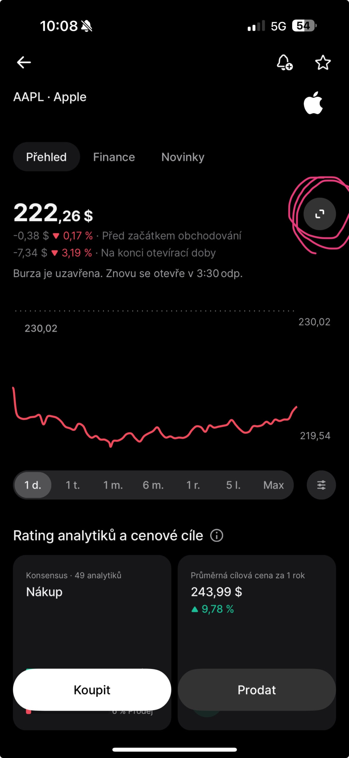 Klasická Revout peněženka dokonce hned u akcií nabízí možnost detailního cenového grafu (šipky od sebe v pravé části), to Revolut Invest ani nemá.
