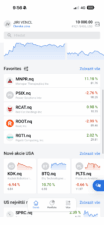 Mobilní aplikace je skutečně přehledná a jednoduchá. V již vybraných kategoriích hned vidíte nejlepší akcie roku, hybatele trhu, nové akcie a samozřejmě vaše oblíbené tituly či nedávno zobrazené.