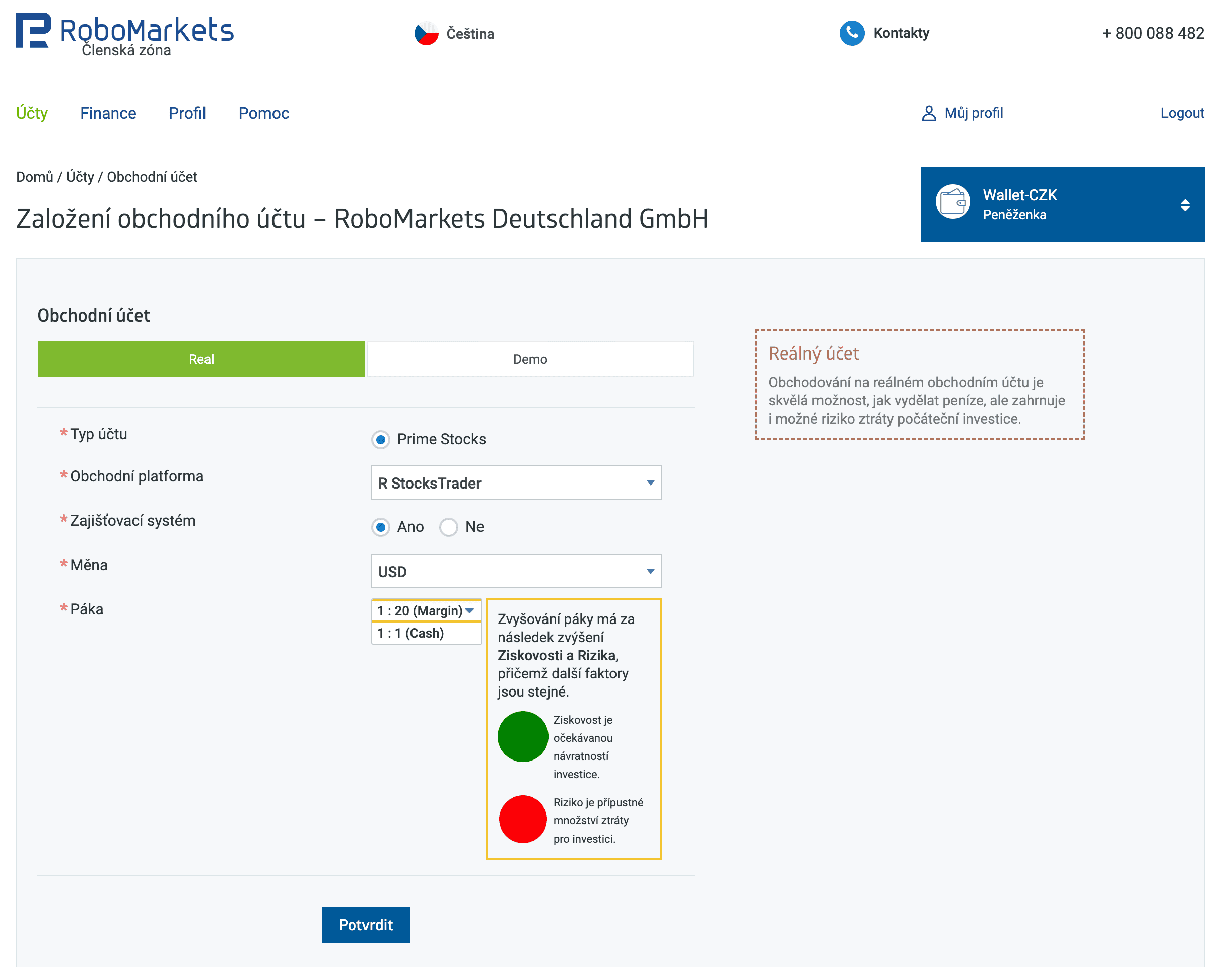 Založit si ho můžete na svém profilu prostřednictvím několika kliknutí a ihned ho v platformě R StocksTrader máte k dispozici a to s libovolným vkladem a finanční pákou až 1:20.