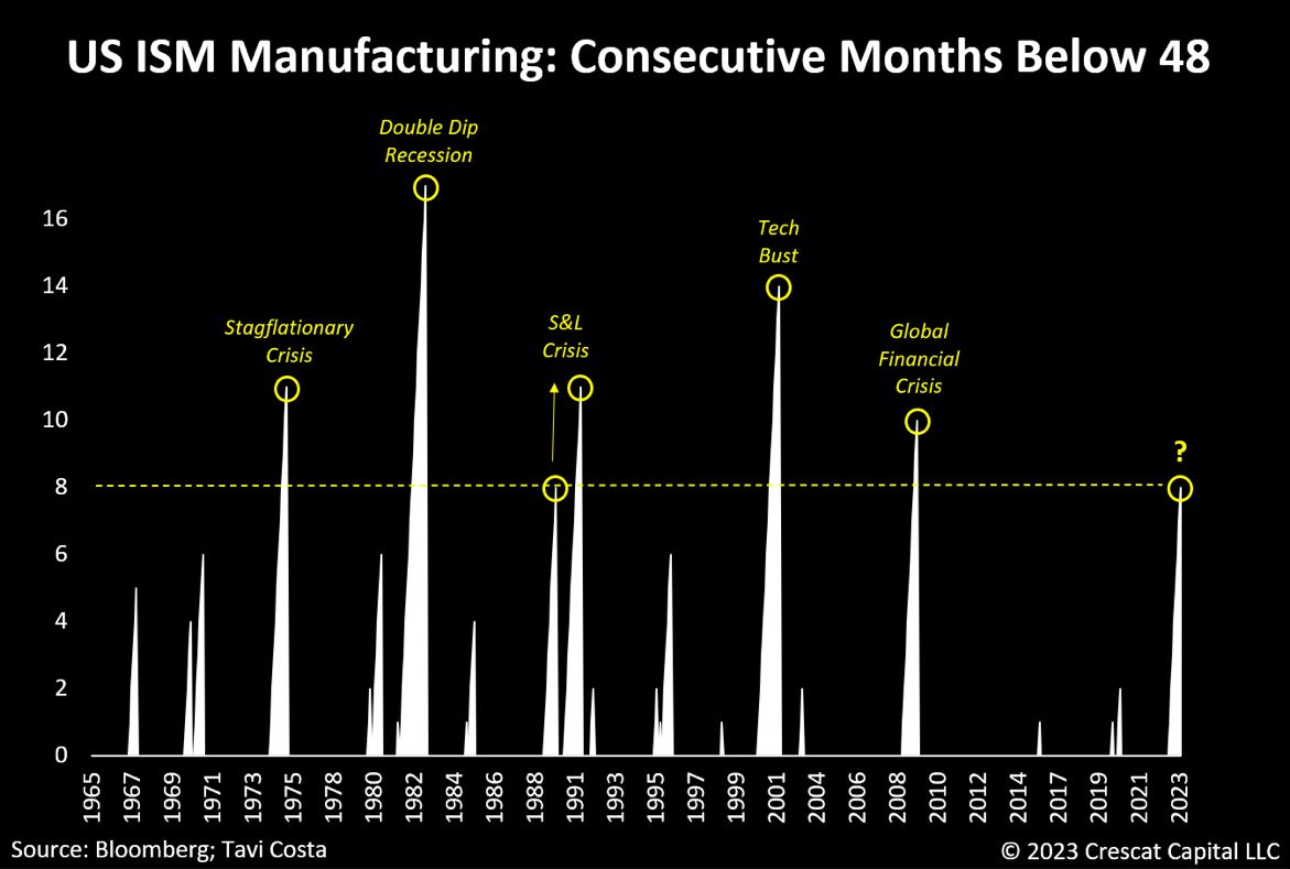 Jedním z mnoha ukazatelů, avizujících recesi je výrobní index ISM . Ten je v kontrakci (pod 50 body) již 10 měsíců za sebou. Víte, kdy byl tak dlouho posledně v kontrakci? Během finanční krize z roku 2008.