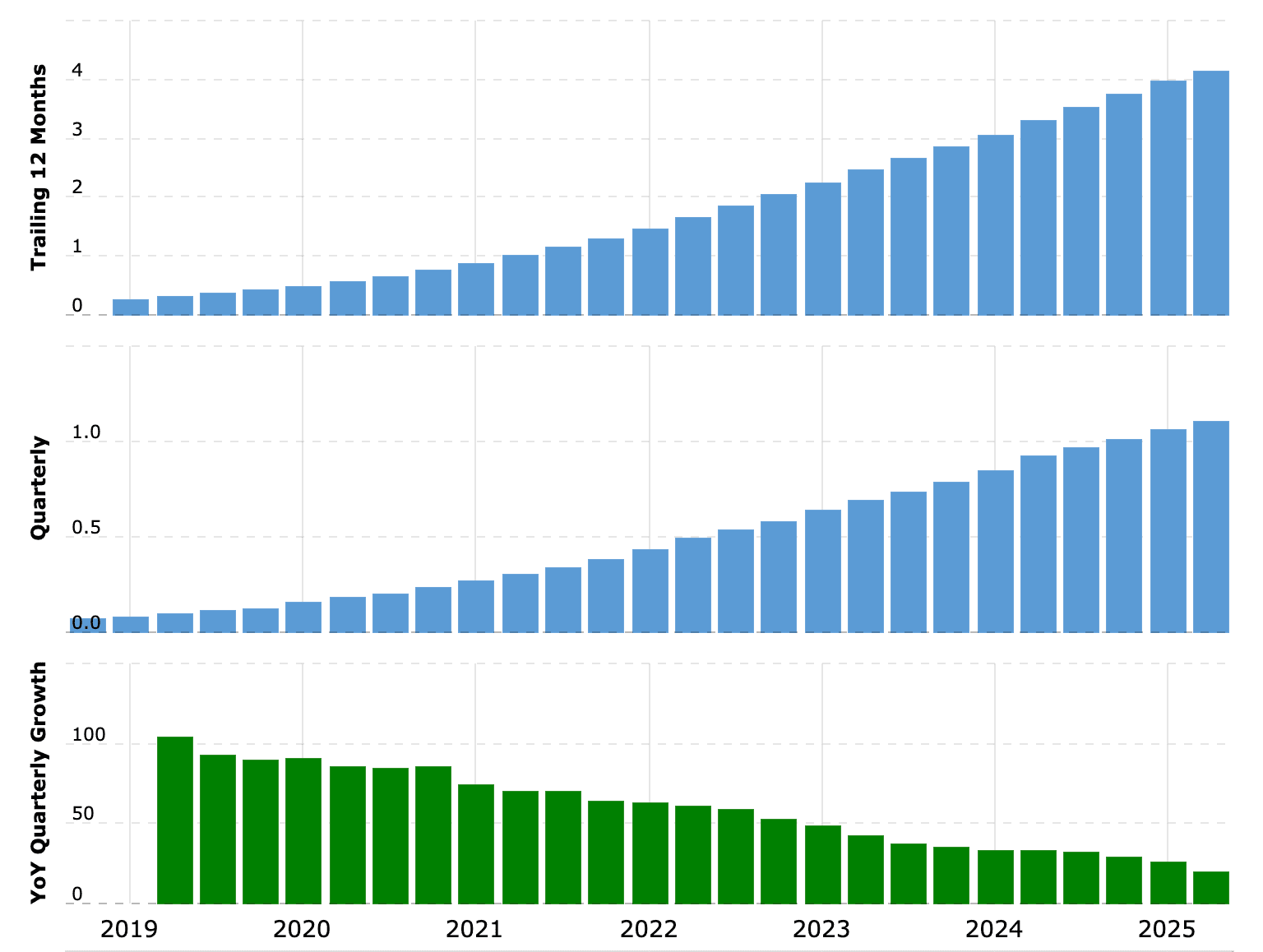 Dlouhodobý vývoj tržeb společnosti CrowdStrike (včetně meziročních změn – dolní graf)