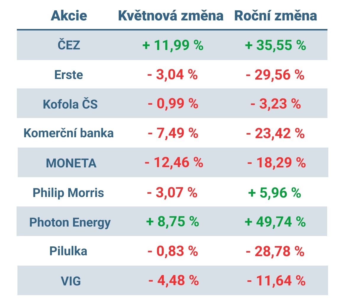 Jak se dařilo vybraným akciím v rámci indexu PX v průběhu května a od začátku roku