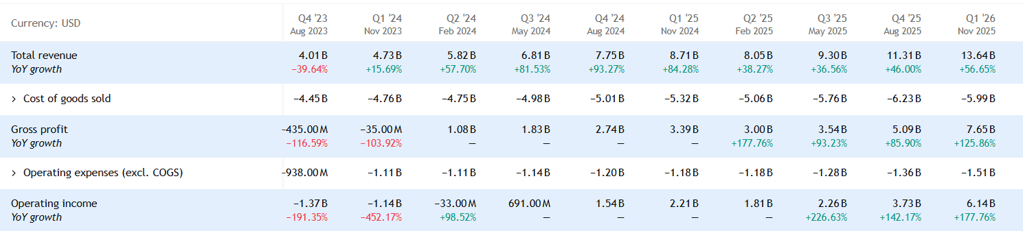 Čistý zisk podle metodiky GAAP činil 5,24 miliardy dolarů. Zisk na akcii (EPS) dosáhl 4,60 dolarů podle GAAP, respektive 4,78 dolarů v očištěné non-GAAP metodice, což bylo výrazně nad konsenzem analytiků.