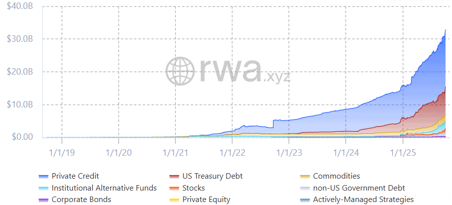 Nejvíce se tokenizuje private credit, poté americký státní dluh a komodity. Pokud bychom začlenili stablecoiny, tak ty naprosto dominují trhu s tokenizovanými aktivy, neboť jejich tržní kapitalizace přesahuje 300 miliard dolarů.