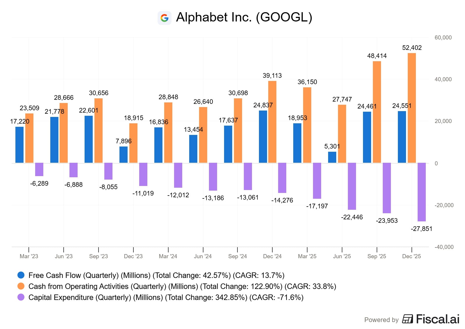 Vývoj cash flow (peněžních toků) u Alphabetu přináší důležitý kontext k aktuálním obavám z masivních investic do umělé inteligence.