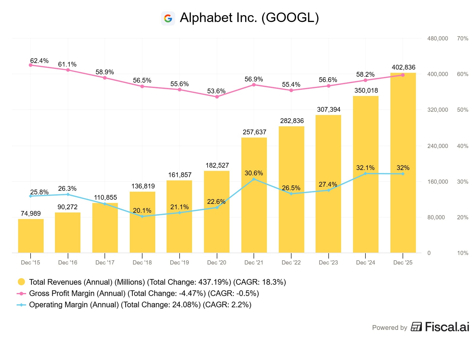 Růst tržeb Alphabetu v posledním desetiletí jasně potvrzuje jeho pozici jednoho z nejvýkonnějších technologických gigantů.