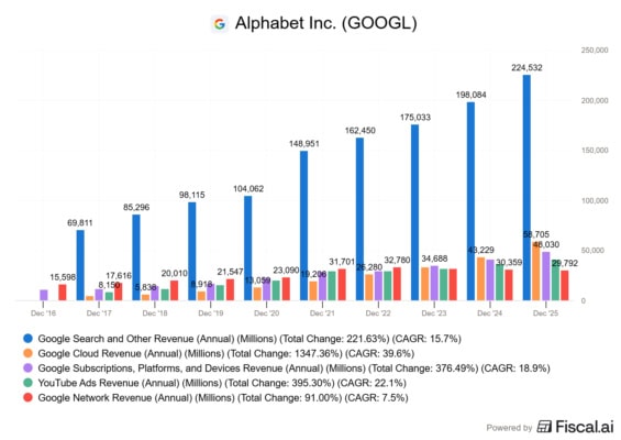 Dominantním pilířem zůstává Google Search a související služby. Jejich tržby vyrostly z necelých 70 miliard dolarů v roce 2016 na více než 220 miliard v roce 2025.